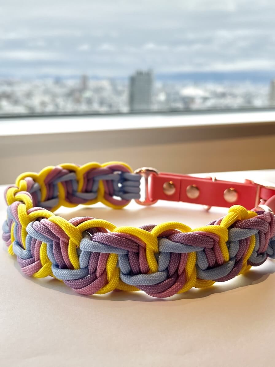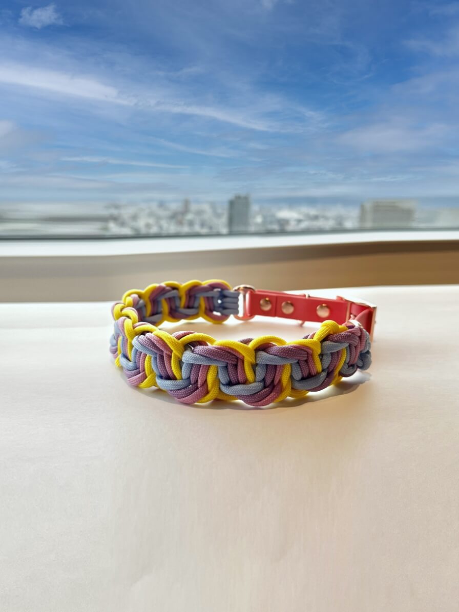 4色の編み込んだパラコードにBiothaneのアジャストを合わせたカラフルな首輪です!